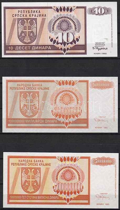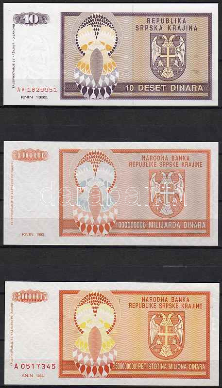 Horvátország/Krajina Szerb Köztársaság 1992-93. 3 db klf bankjegy T:I https://www.darabanth.com/de/46-Fernauktion/46.0/Numismatik/~191/HorvatorszagKrajina-Szerb-Koztarsasag-1992-93-3-db-klf-bankjegy-TI~II93153