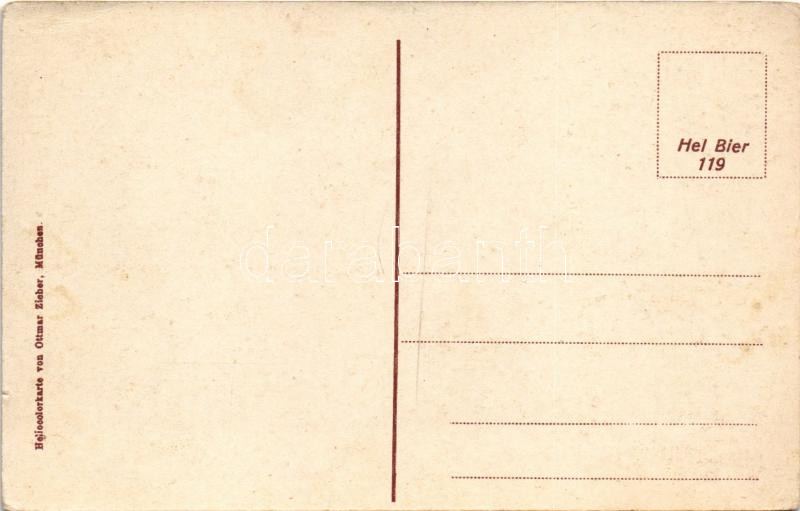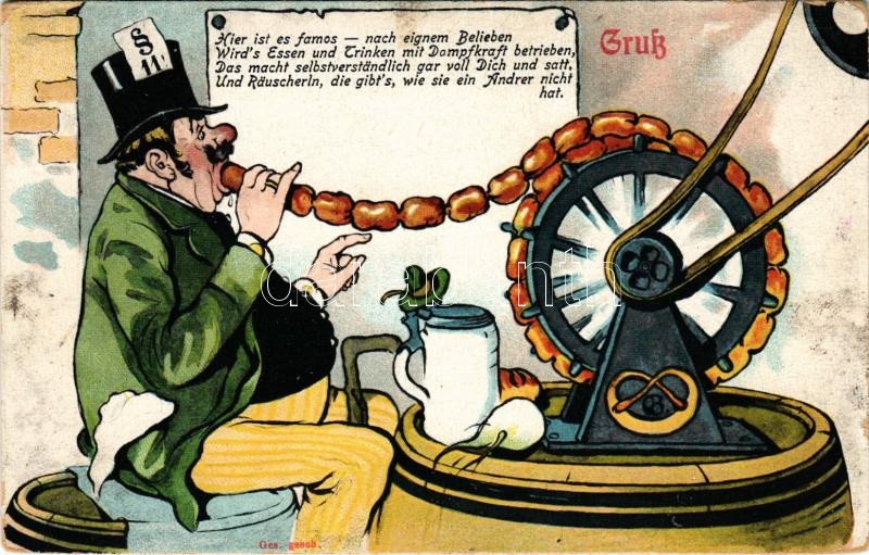 Man eating sausages and drinking art postcard. Ottmar Zieher (EK)