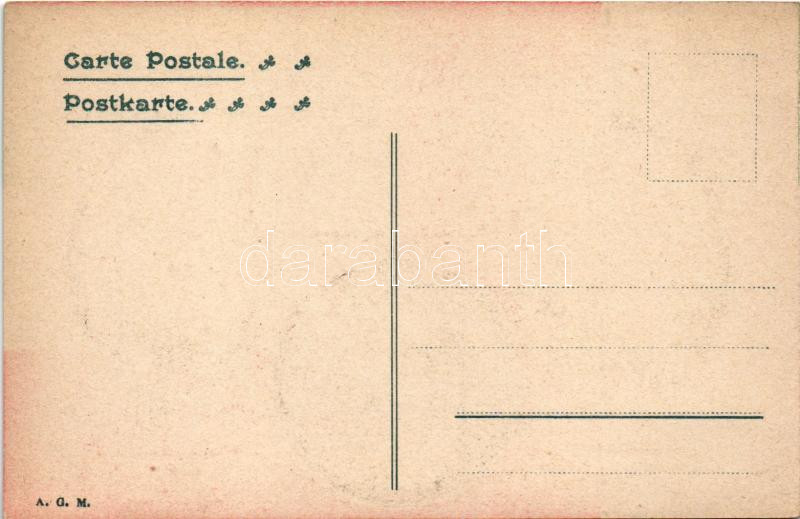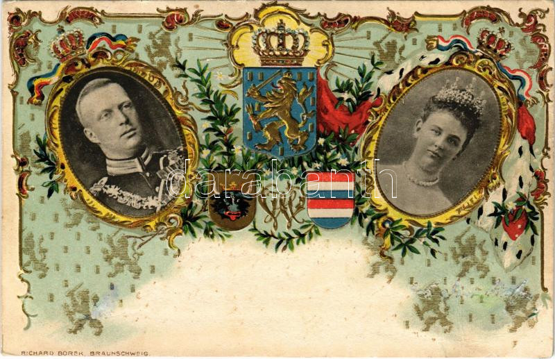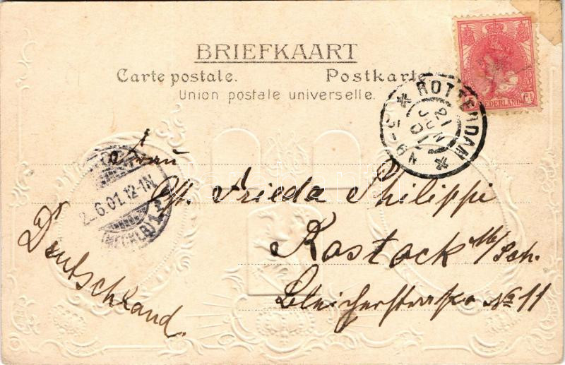 1901 Wilhelmina, Queen of the Netherlands and her husband Prince Henry, Duke of Mecklenburg-Schwerin. Art Nouveau, floral, Emb. litho with coats of arms (lyukak / pinholes)