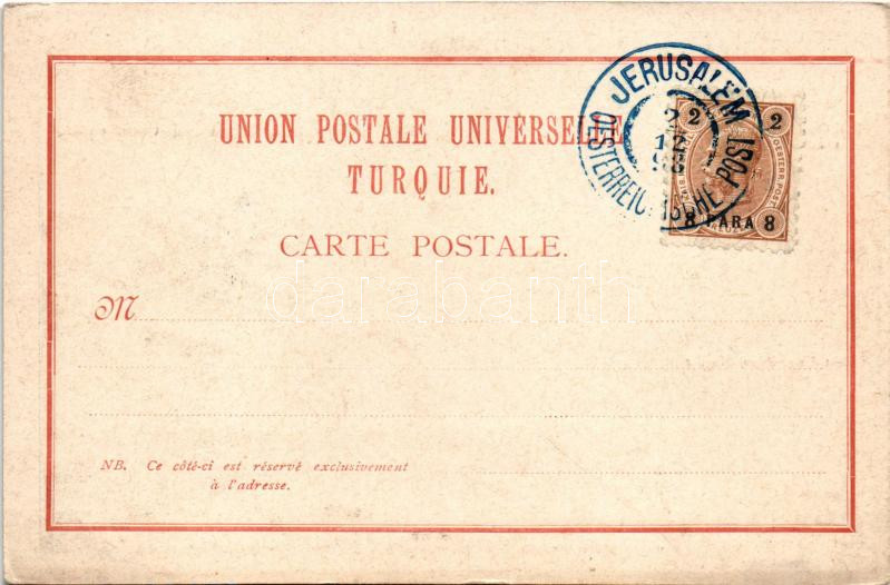 1898 Jerusalem, Zur Erinnerung an das 50 jährige Regier. Jubiläum Se. K.u.k. Kap. Majestät Kaiser Franz Josef I. K.u.k. Öst. Vice-Consulat 1849. Öst.-Ung. Pilger-Hospiz und Consulat 1898 / Ferenc József uralkodásának 50. évfordulójára kiadott szecessziós jeruzsálemi emléklap, osztrák-magyar konzulátus és zarándok kórház Jeruzsálemben / 50th anniversary of Franz Joseph's reign, Austor-Hungarian consulate and pilgrim hospital in Jerusalem. E. Nister Art Nouveau, floral (EK)