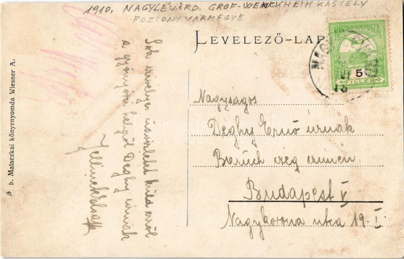 Nagylévárd, Velké Leváre; Gróf Wenckheim kastély. Malaczkai könyvnyomda Wiesner A. kiadása / castle (r)
