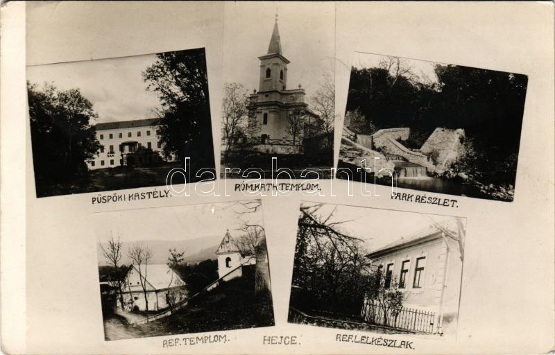 1942 Hejce, Püspöki kastély, Római katolikus és református templom, park részlet, református lelkészlak. Tóth Irén photo (EB)