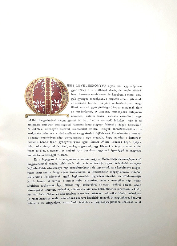 Mikes Kelemen (1690-1761) Törökországi levelei a magyar rokokó próza legnagyszerűbb alkotása, mely egészen 1794-ig maradt kéziratban. Szövegközti rajzokkal és színes táblákkal, könyvdíszekkel gazdagon illusztrált díszalbumunk az emigrációba kényszerült fejedelem 1906. évi hazai újratemetése alkalmából készült. Edvi Illés Aladár akvarelljein megelevenednek a száműzött udvar rodostói életkörülményei, lakókörnyezete; a keleties architektúrájú látképeket és enteriőröket emlékezetesen ellenpontozzák az erdélyi Zágonról, Mikes szülőföldjéről készített, bensőséges hangulatú festmények. Valamennyi tábla és hasonmás előtt feliratozott hártyapapír.