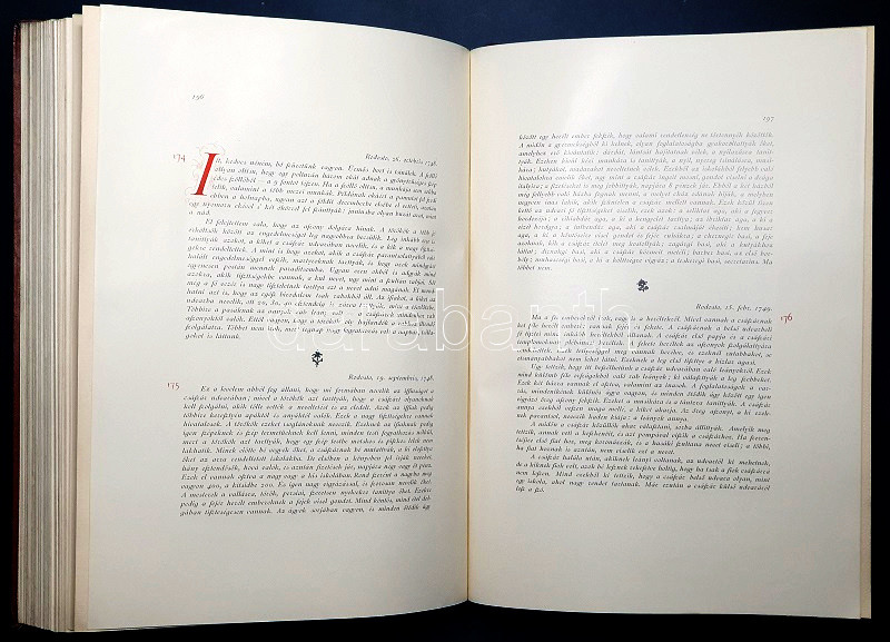 Öt bordára fűzött, díszesen aranyozott gerincű korabeli bőrkötésben, vörös festésű lapszélekkel. Szép példány.
