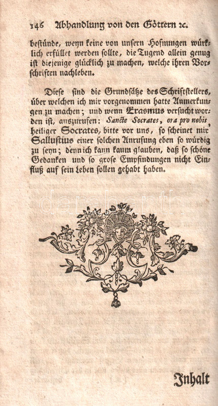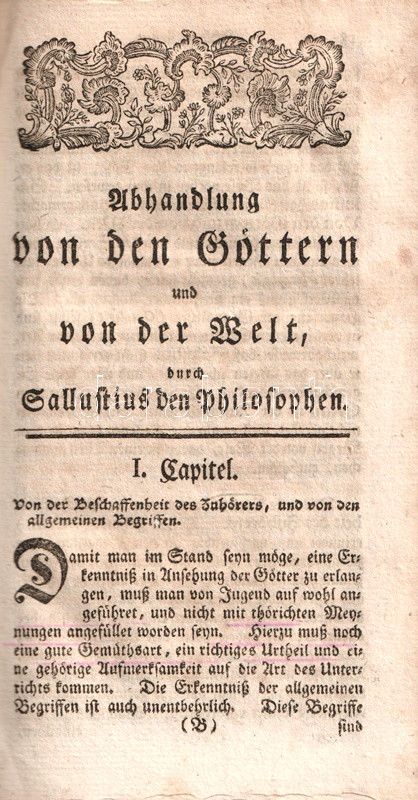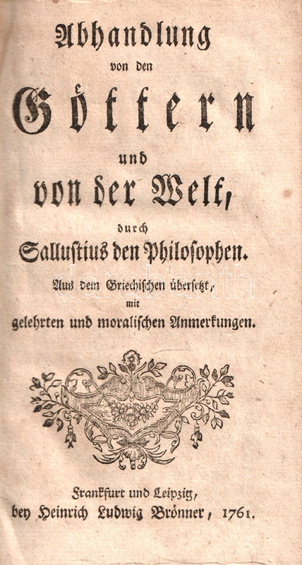 A fordító feltüntetése nélkül készült kötetünk Sallustius római történetíró (Kr. e. 86-35) istenekről írt értekezését közli német nyelven. Gót betűs szövegoldalakkal, fametszetű könyvdíszekkel.