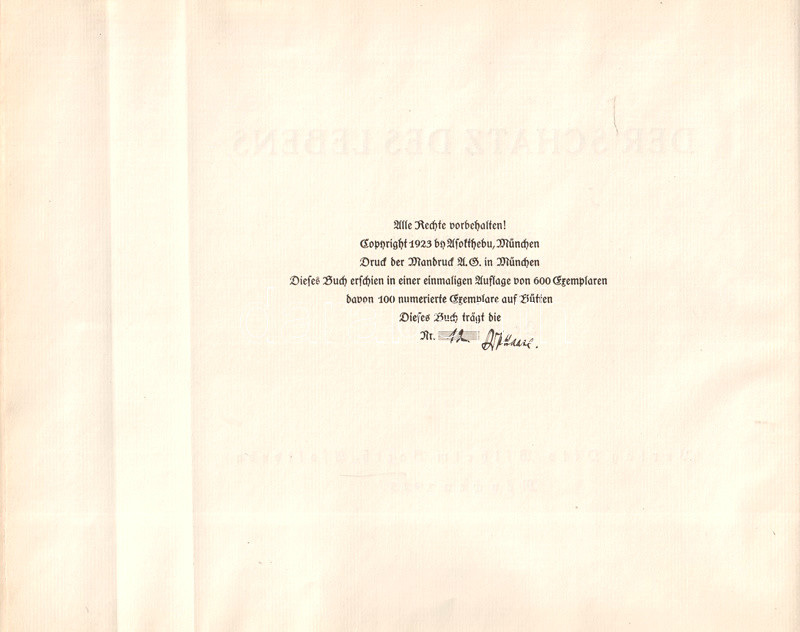 Kolofon: "Dieses Buch erschien in einer einmaligen Auflage von 600 Exemplaren, davon 100 numerierte Exemplare auf Bütten. Dieses Buch trägt die Nr. 12. Dr. Haase [aláírás]."