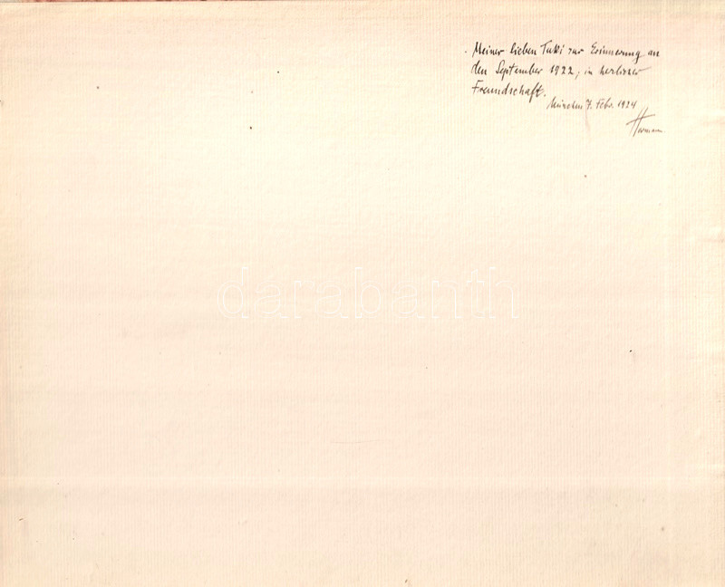 Az első előzéken a szerző saját kezű dedikációja: "Meiner lieben Tuki zur Erinnerung an den September 1922, in herzlicher Freundschaft. München, 7. Febr. 1924. Hermann."
