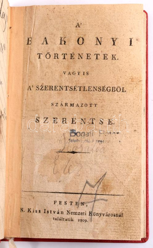[Dobay György]: A' bakonyi történetek, vagyis A' szerentsétlenségből származott szerentse. Pesten, 1809, N. Kiss István Nemzeti Könyvtárosnál, 94 p. Átkötött modern félvászon-kötés, kissé kopott borítóval, körbevágott, javított kötéssel, a kötéstáblák belsején és az előzéklapokon, és az utolsó üres oldalon, valamint néhány lapszélen bejegyzésekkel, foltos lapokkal, névbélyegzésekkel. Ritka!