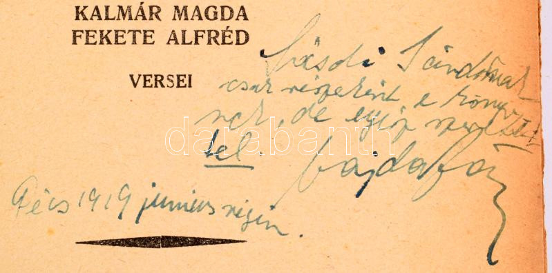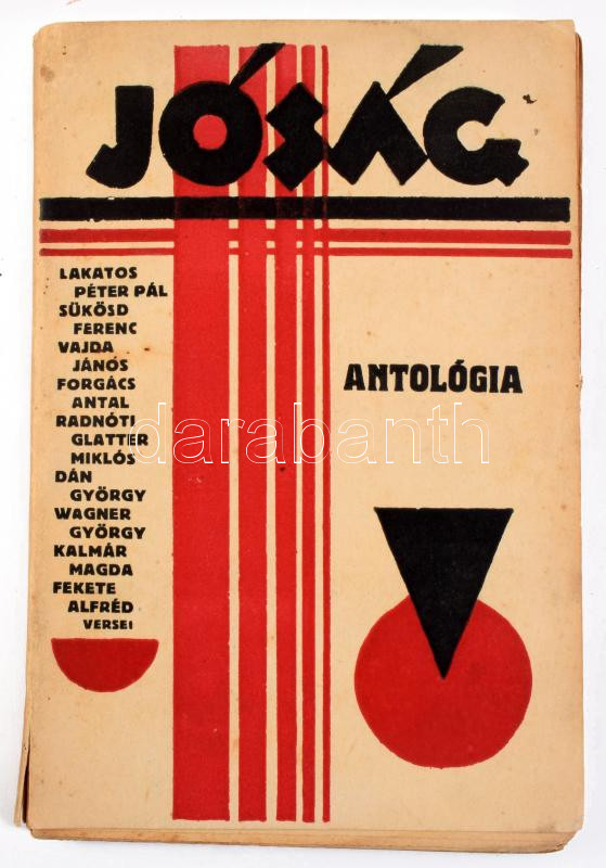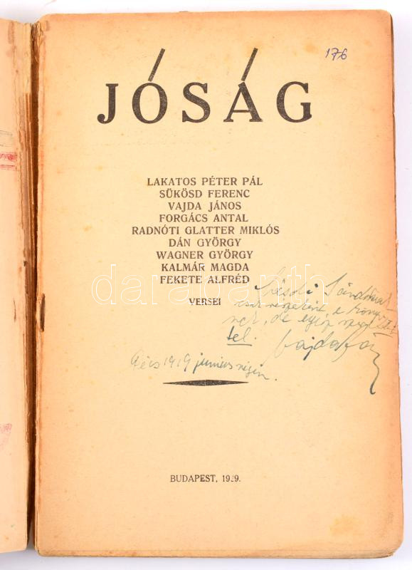 Jóság (Antológia). Lakatos Péter Pál, Sükösd Ferenc, Vajda János, Forgács Antal, Radnóti Glatter Miklós, Dán György, Wagner György, Kalmár Magda, Fekete Alfréd versei. Budapest, 1929, Hoffmann és Társa könyvnyomda, 125 p. Hollán Herry által tervezett kiadói borítóban, gerincen kis sérüléssel. A könyv érdekessége, hogy ebben jelentek meg először Radnóti Miklós versei. Vajda János dedikálásával