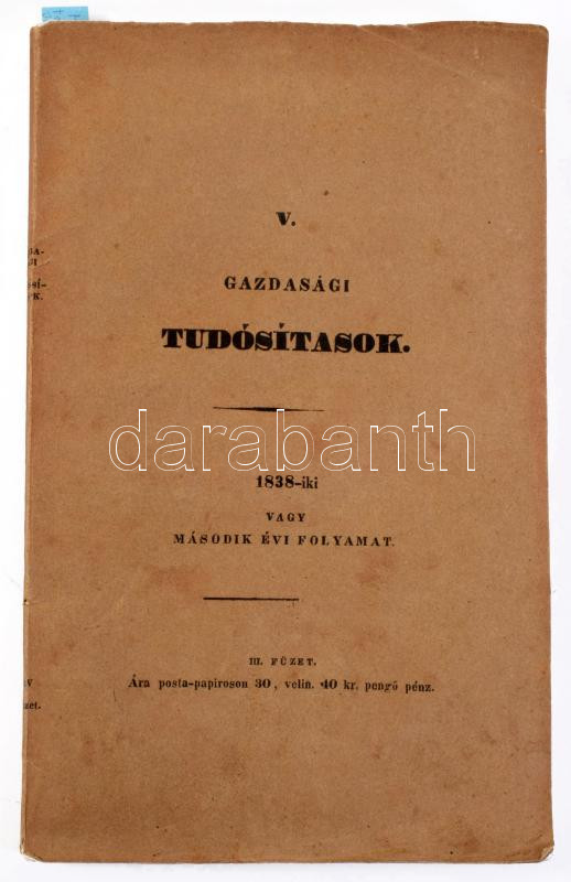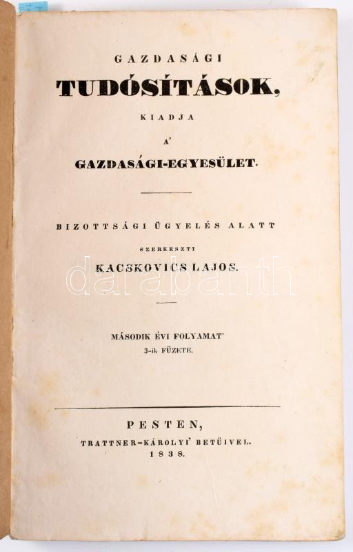 Kacskovics Lajos: Gazdasági tudósítások. Kiadja a? Gazdasági-Egyesület. Bizottsági ügyelés alatt szerkeszti ~. Második évi folyamat 3-ik füzete. Pesten, 1838. Trattner-Károlyi ny. 83+(1)p. 1 kihajt. mell. Kiadói papírborítóban.