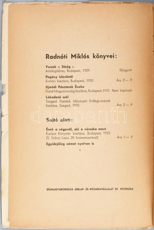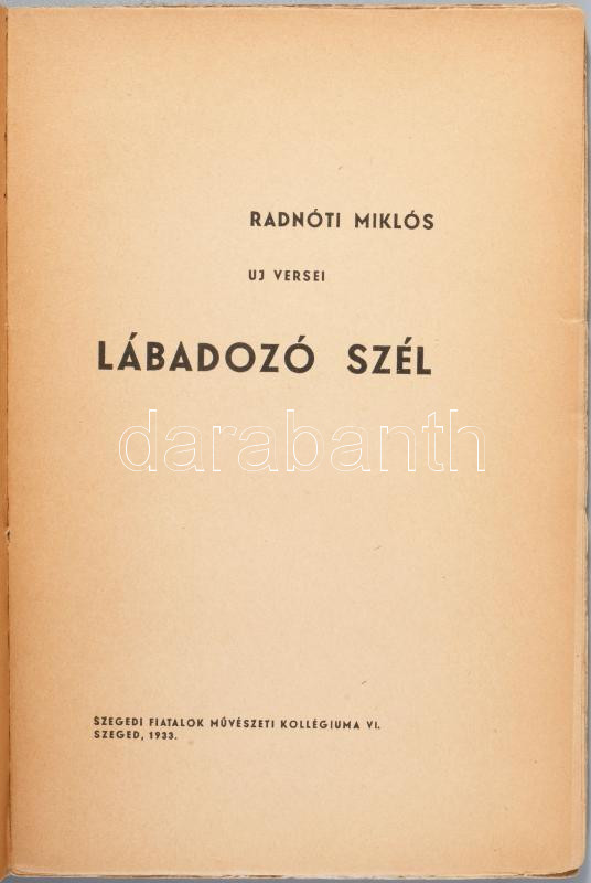 Radnóti Miklós: Lábadozó szél. Uj versei. Szegedi Fiatalok Művészeti Kollégiuma VI. Szeged, 1933., Szegedi Fiatalok Művészeti Kollégiuma, (Délmagyarország-ny.) 64 p. Első kiadás! A borító illusztrációja Dóczi György linómetszete. Számozatlan példány!