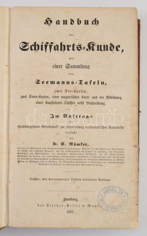 [Hajózási kézikönyv] Rümker, C. (Carl): Handbuch der Schiffahrts-Kunde, mit einer Sammlung von Seemanns-Tafeln, zwei See-Karten, einer magnetischen Karte und der Abbildung eines Kauffahrthei-Schiffes nebst Beschreibung. Hamburg, 1857 Perthes-Besser & Mauke, 1t XII, 372 p, XII, 546 p. 6 kih t. Aranyozott egészbőr kötésben / In gold painted leather binding .