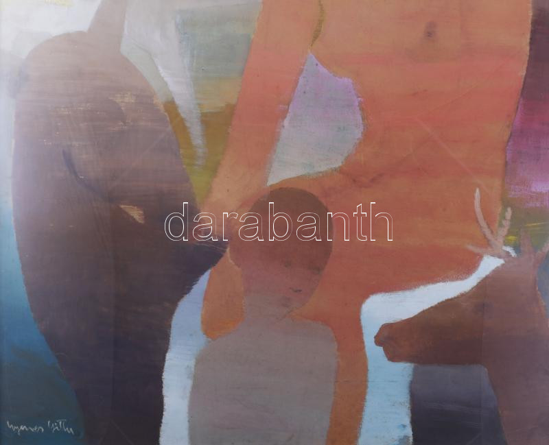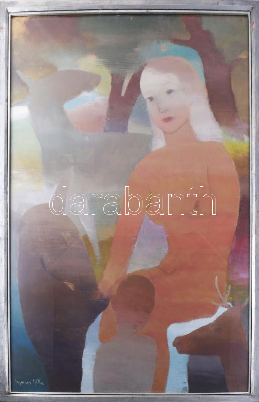 Gyenes Gitta (1888-1960): Lány őzikékkel. Tempera, karton, jelzett. Üvegezett, dekoratív fakeretben. 100x70 cm. KIZÁRÓLAG SZEMÉLYES ÁTVÉTEL, NEM POSTÁZZUK / ONLY PERSONAL COLLECTION IN OUR OFFICE!