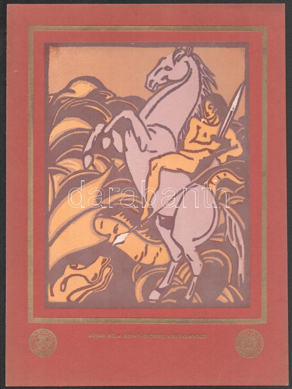 Kádár Béla (1877-1956): Szent György, a sárkányölő. Színes linómetszet, papír. Megjelent 1911-ben, a Művészház (Művészeti Egyesület) által kiadott, Modern Magyar Képtár c. mappában. 22,5x17,5 cm