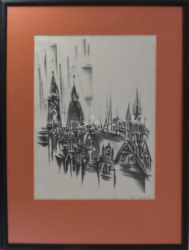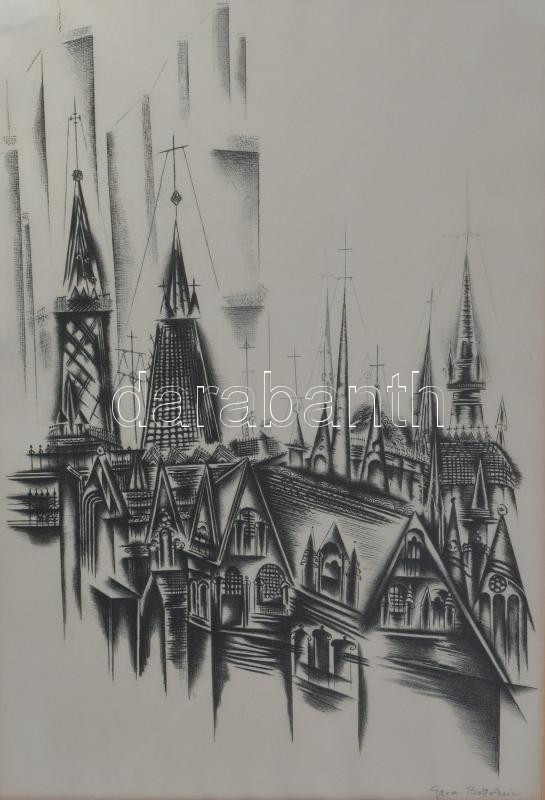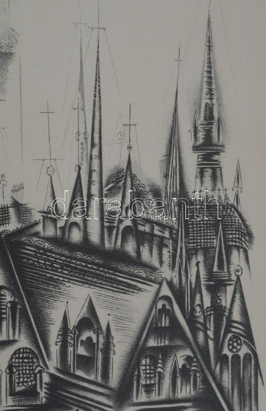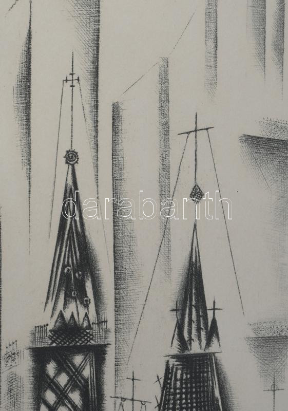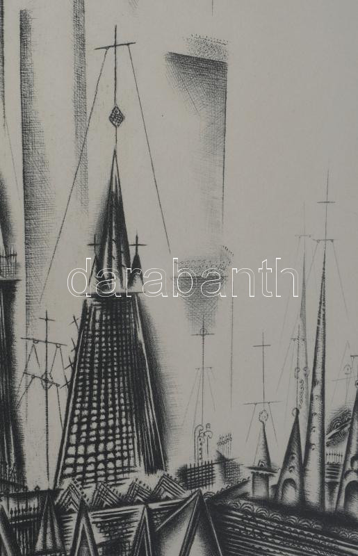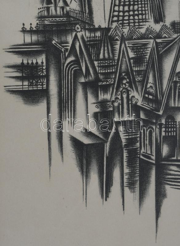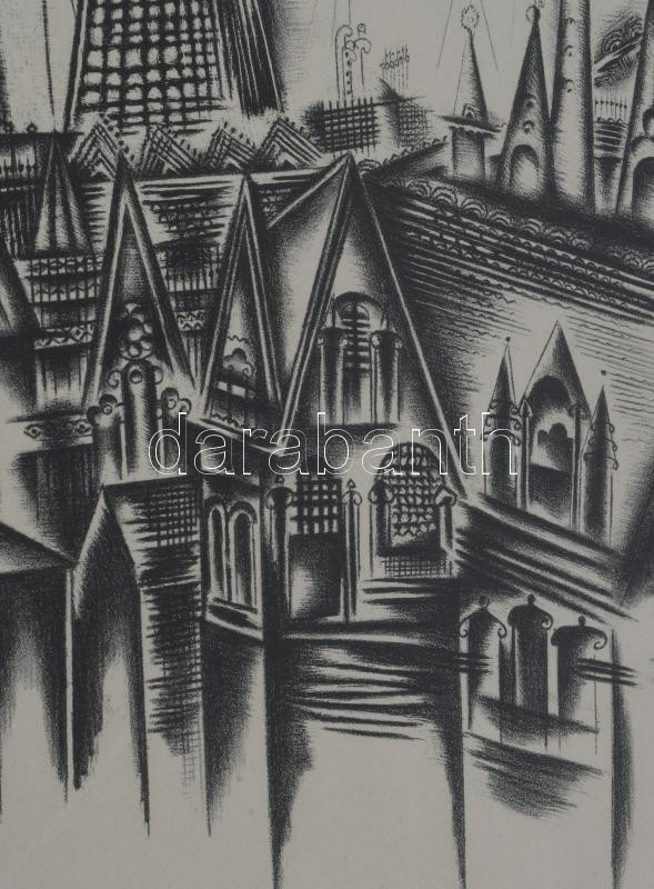 Gross-Bettelheim Jolán (1900-1972): Nagyvárosi látkép. Litográfia, papír, jelzett. Üvegezett fakeretben. 45×32 cm.