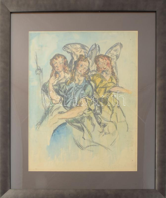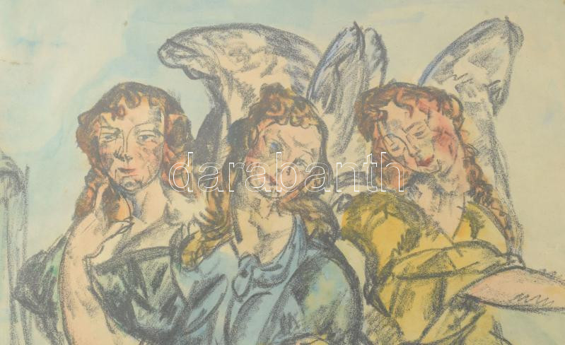 Perlrott-Csaba Vilmos (1880-1955): Három angyal. Színezett litográfia, papír, jelezve jobbra lent, 54x43 cm