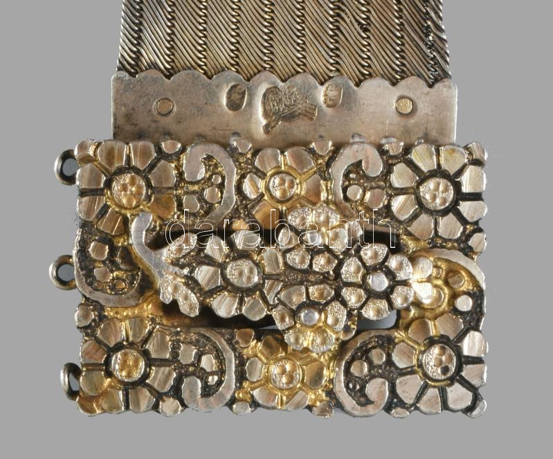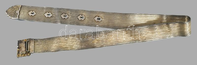 cca 1890 Ottomán ezüst (Ag) öv a Semsey grófi családi hagyatékból. Jelzett, a tárgyon végig szultáni tughra jelzések, illetve a csaton utófémjelezett 2016-2026 közötti magyar fémjel, 800 ezrelékes ezüst, h: 96 cm, 415g /// Circa 1890 Ottoman silver (Ag) belt from the estate of the Semsey count family. Marked; the piece bears sultanic tughra marks throughout, and on the clasp a later Hungarian hallmark applied between 2016-2026. 800% silver. Length: 96 cm, weight: 415 g.