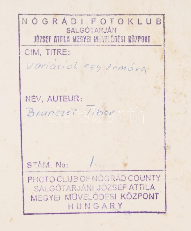 1977 Brunczel Tibor salgótarjáni fotóművész alkotása (Variációk egy témára), 1 db nagyméretű, feliratozott, vintage fotó, ezüst zselatinos fotópapíron, a használatból eredő kisebb hibákkal, kasírozva; a fotó része volt a néhai Népművelési Intézet által összeállított, FOTÓMAPPA 1977 című vándor-fotókiállításnak, 38,5x57 cm