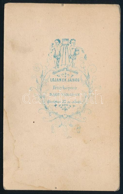 1864 revisnyei Reviczky László (1805-1868) 1848-as honvédőrnagy, Bihar megyei táblabíró és családja: felesége Stachó Karolina; gyermekeik Reviczky Szevér (1840-1864) író, újságíró (1864-ben párbajban agyonlőtték) és Reviczky Szeréna. Vizitkártya Lojanek János nagyváradi (Oradea) műterméből, feliratozva, kis ázásnyommal, 10x6,5 cm