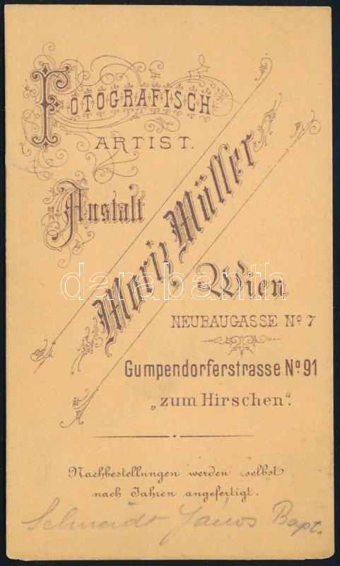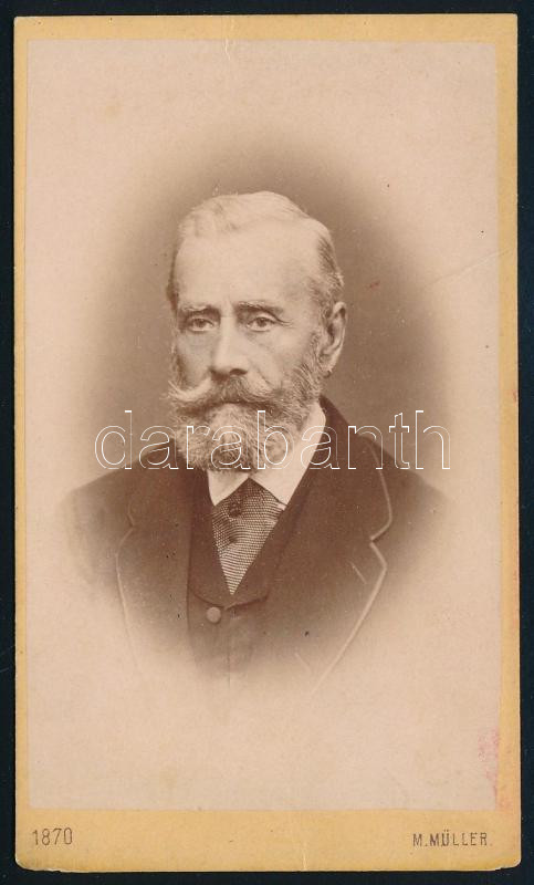 1870 Schneidt János (1802 k.-1870) pénzügyi tanácsos, városi képviselő, 1848-ban a Batthyány-kormány (az első független, felelős magyar kormány) idején a Kossuth Lajos által vezetett pénzügyminisztérium számvevőségi bíráló tisztje (neve megtalálható Az első magyar ministerium összes személyzetének név- és lakkönyve című, 1848-ban megjelent műben). Vizitkártya Moritz Müller bécsi műterméből, a hátoldalon feliratozva, 10x6 cm