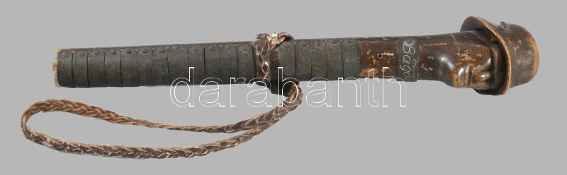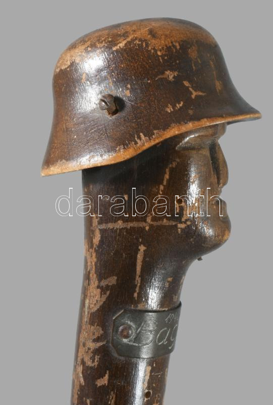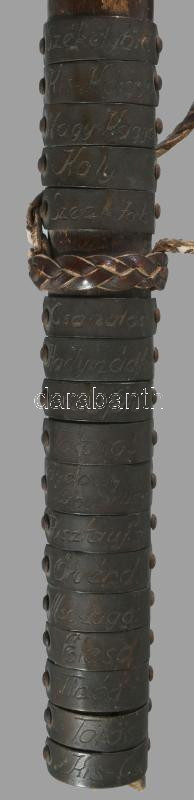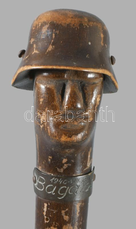 1940 Erdélyi bevonulás alatt használt katonai sétabot faragott fa vége, rajta a felszabadított települések neveivel, h: 27 cm