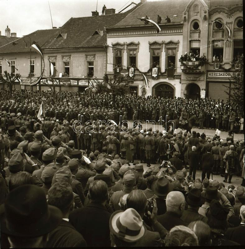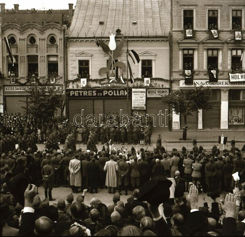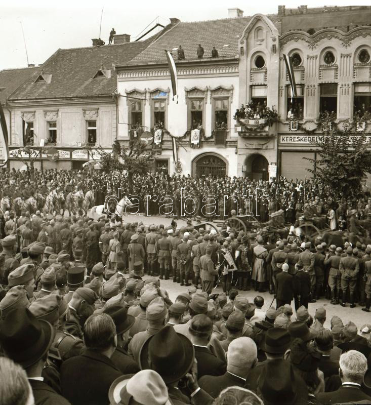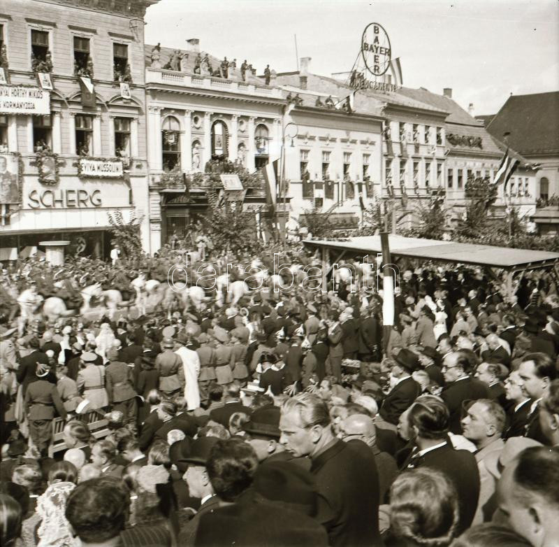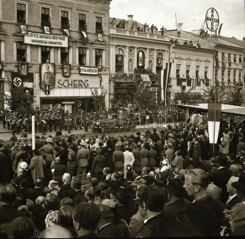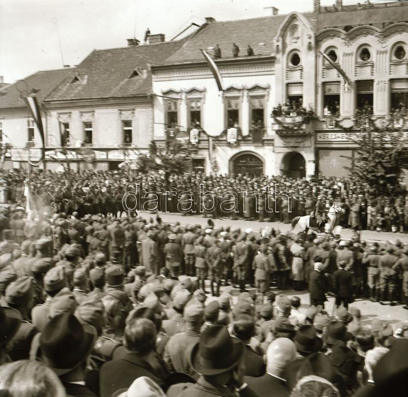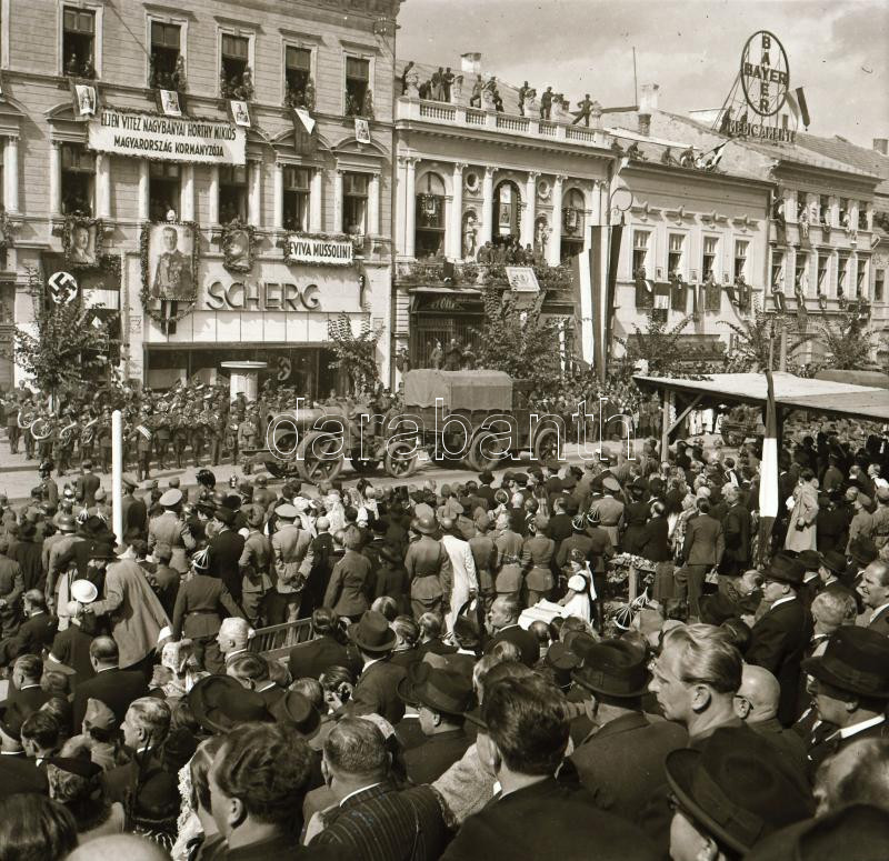 1940 Kolozsvár (Cluj), a magyar csapatok bevonulásának ünnepsége, 9 db eredeti negatív, a felvételeken látható 38M Toldi harckocsi, (Fiat-Ansaldo L3/35) 35M kisharckocsik, Horthy, Hitler és Mussolini portréi, stb., 6x6 cm