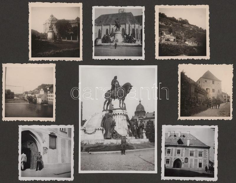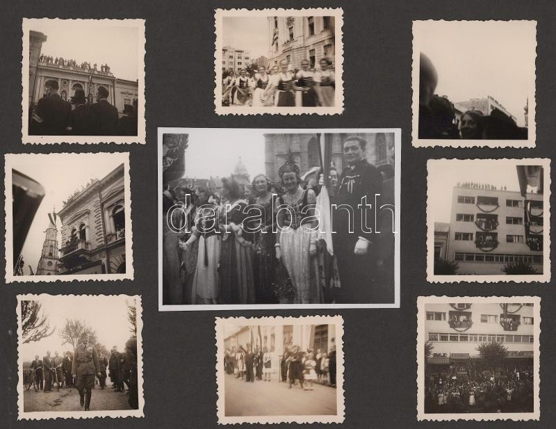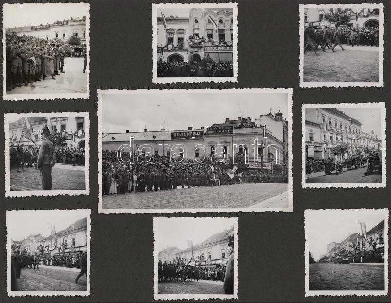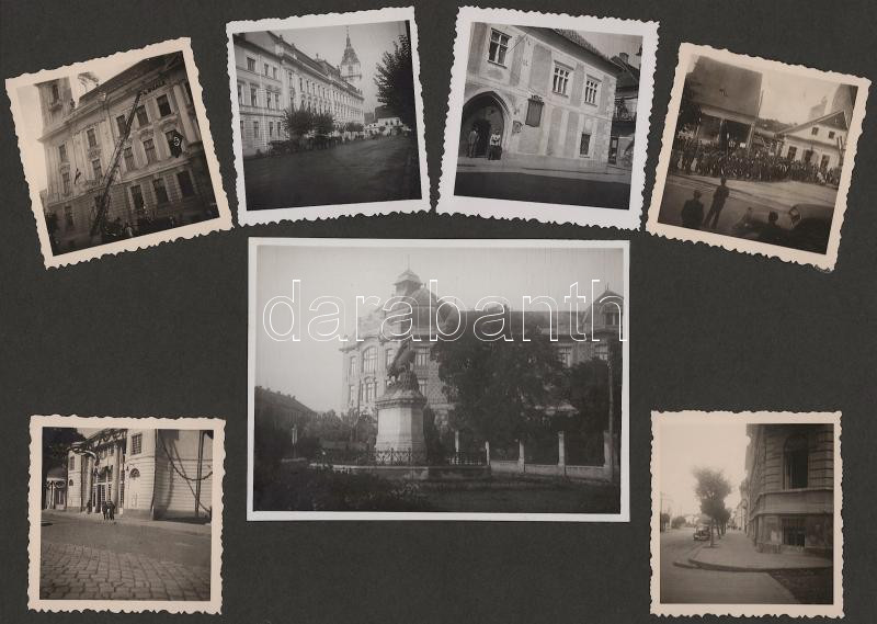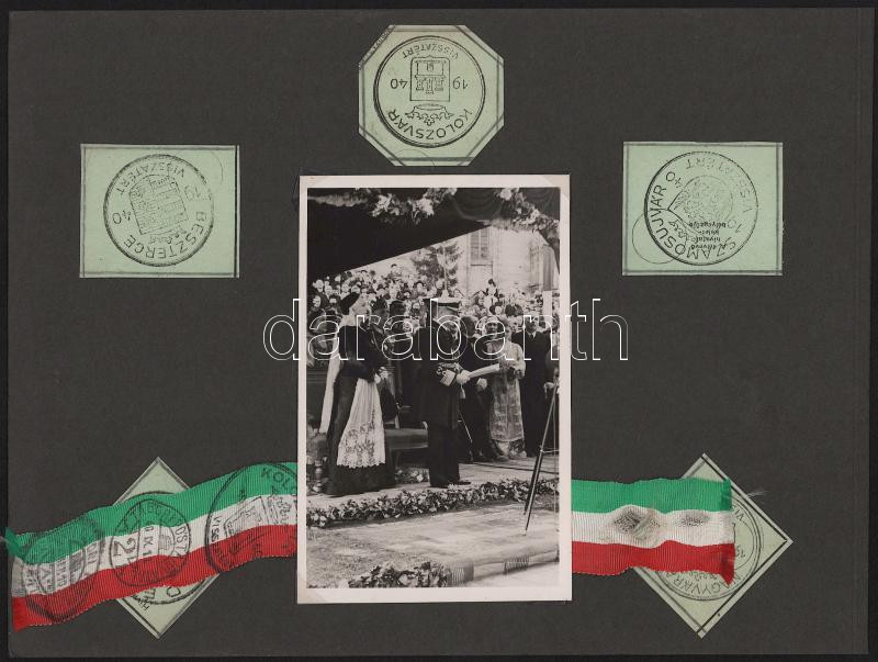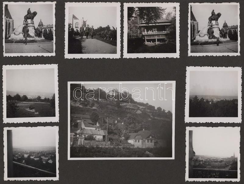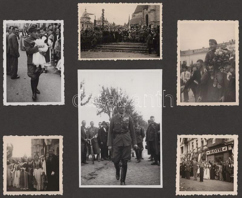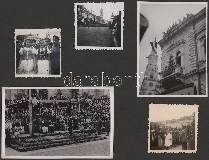 1940 Erdélyi bevonulás fotói, benne számos kolozsvári fotóval, két fotón Jány Gusztáv honvéd tábornok, két fotón Horthy Miklóssal, az egyik Horthy fotó mellett felragasztott visszatért bélyegzésekkel (Nagyvárad, Szamosujvár, Dés, Beszterce, Kolozsvár.),99 fotóval, 7 kartonlapon, 6x6 cm és 14x9 cm közötti méretben, kartonlap: 21x27,5 cm