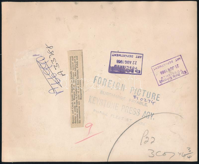 1968 Csehország orosz és cseh katonák barátkozása a "Duna hadművelet" során, mely egy több ország részvételével zajlott hadgyakorlattal indult, melynek álcája alatt a megszálló csapatok már benn voltak, vagy visszatérhettek az országba. Feliratozott sajtófotó 26x21 cm