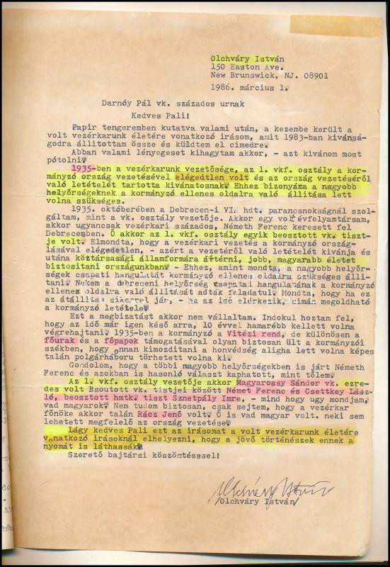 Gépelt kézirat, az utolsó két levélen Olchváry aláírásával. Az utolsó előtti lap másik oldalán ugyancsak gépelt írás 1983-ból (másik gépelt levél töredéke). Az utolsó levélen 1986-os magyarázó levél a korábbi írásához. Benne számos bejelöléssel Darnóy Pál ezredestől, 10 p. +2 sztl. lev.