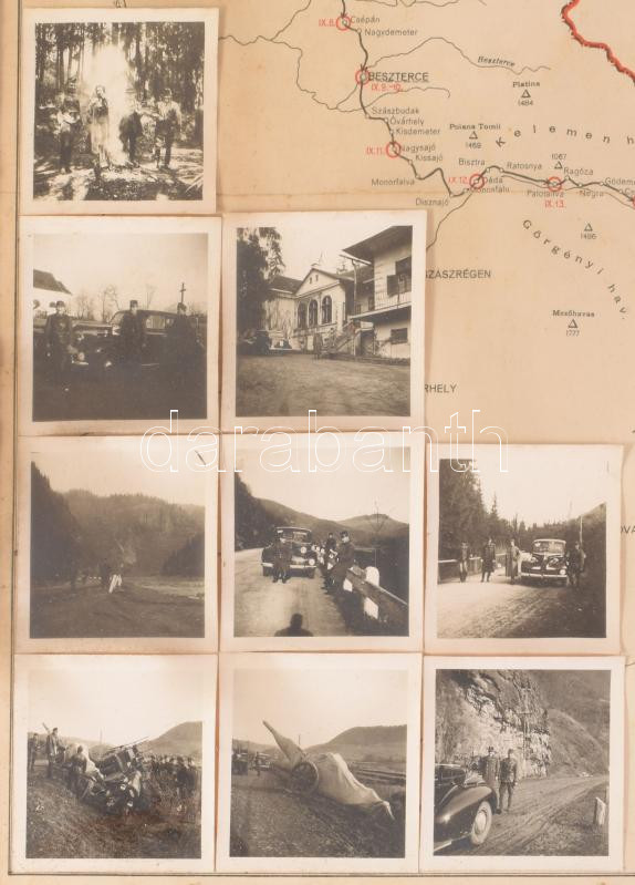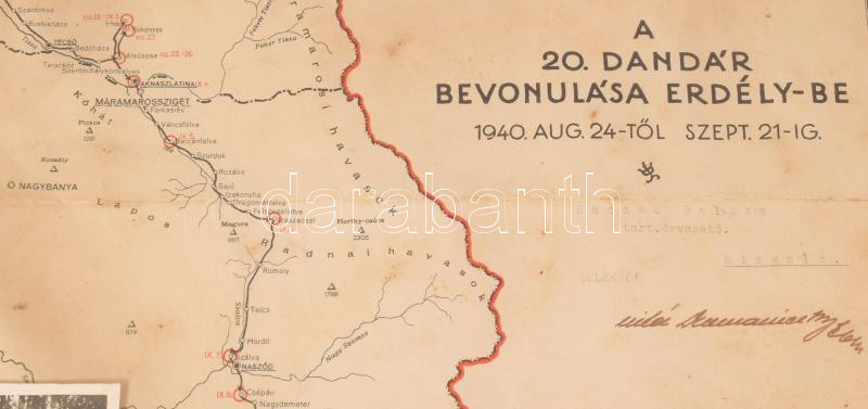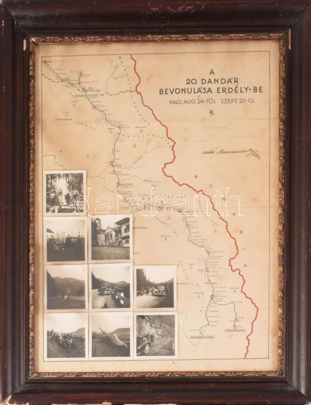 1940 A 20. dandár bevonulása Erdélybe 1940. aug. 24-től szept. 21-ig, emléklap az útvonalat ábrázoló térképpel és a bevonulás során készült eredeti fotókkal, névre szóló (Raczkó Balázs tart. őrvezető, Miskolc). Dekoratív, üvegezett fakeretben, a kereten sérülésekkel, látható: 43x33 cm, teljes méret: 52x42,5 cm