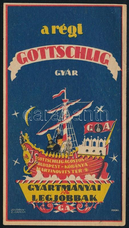 cca 1930-1940 Gottschlig Ágoston számolócédula, 'A régi Gottschlig gyár gyártmányai a legjobbak', Globus Bp., Kozma Lajos (1884-1948) építész, grafikus, iparművész által tervezett számolócédula, 12x6 cm