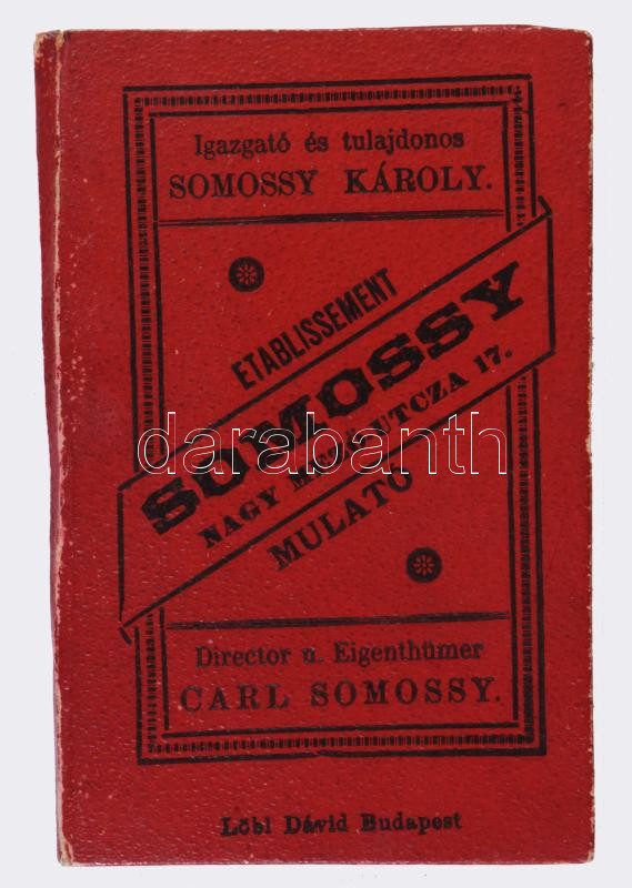 1896 Somossy Mulató. Műsor. Program. Nagy Mező-utcza 17. Igazgató és tulajdonos: Somossy Károly. 1896. szeptember 10. Főrendező: Kőszeghy Jenő. Karnagy: Rosenzweig Vilmos. Benne izgalmas műsorral magyar és német nyelven. Bp., Löbl Dávid-ny., két képpel (Látkép a királyi vártól, Magyar Királyi Operaház) és kihajtható programfüzettel, a programfüzet "elején" Somossy Károly arcképével. A borító hátán a mulató képével [ma: Budapesti Operetteszínház.] Eredeti kiadói egészvászon borítóval, a borítón kis kopásnyomokkal, jó állapotban, 11x7 cm. Ritka!