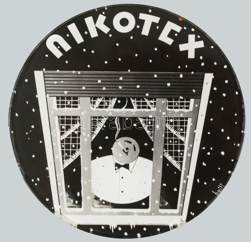 cca 1930-1940 "Nikotex" reklám korong, jelzett a nyomaton (Bojti), papír (nyomat), üveg korong, üveg korong: d: 7,5 cm