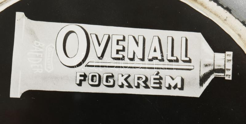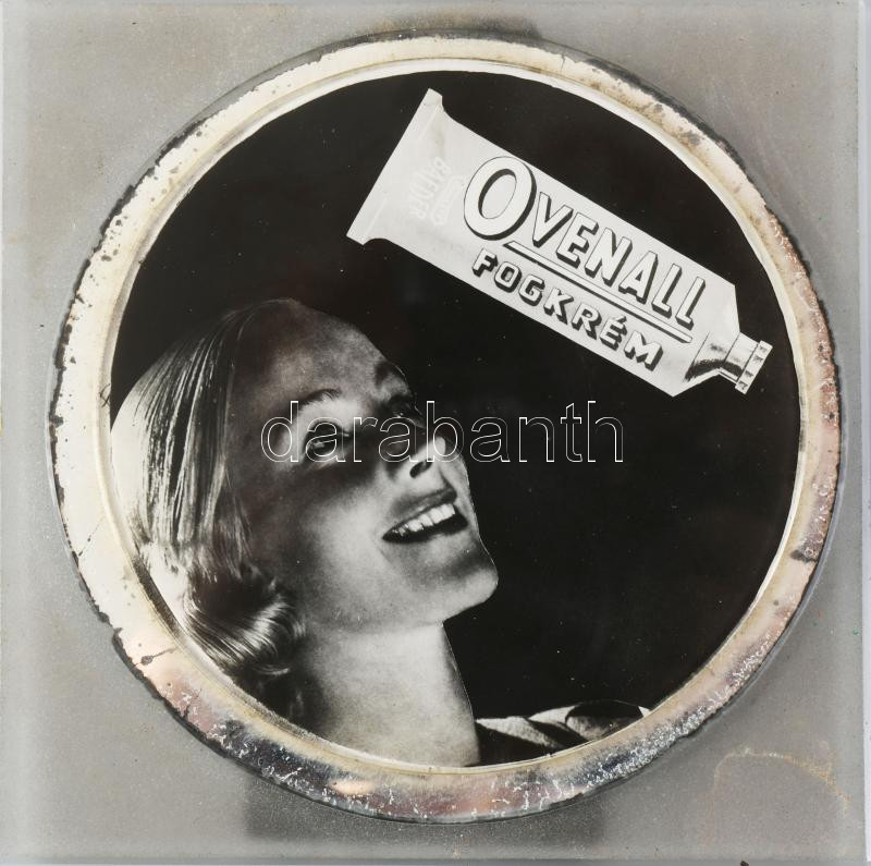 cca 1930-1940 "Ovenall fogkrém" reklám korong, jelzett a nyomaton (Bojti), papír (nyomat), üveg korong üveg lapon, a hátán tartóval, az üveg korong és a lap kettévált, korong: d: 7,5 cm, lap: 10x10 cm