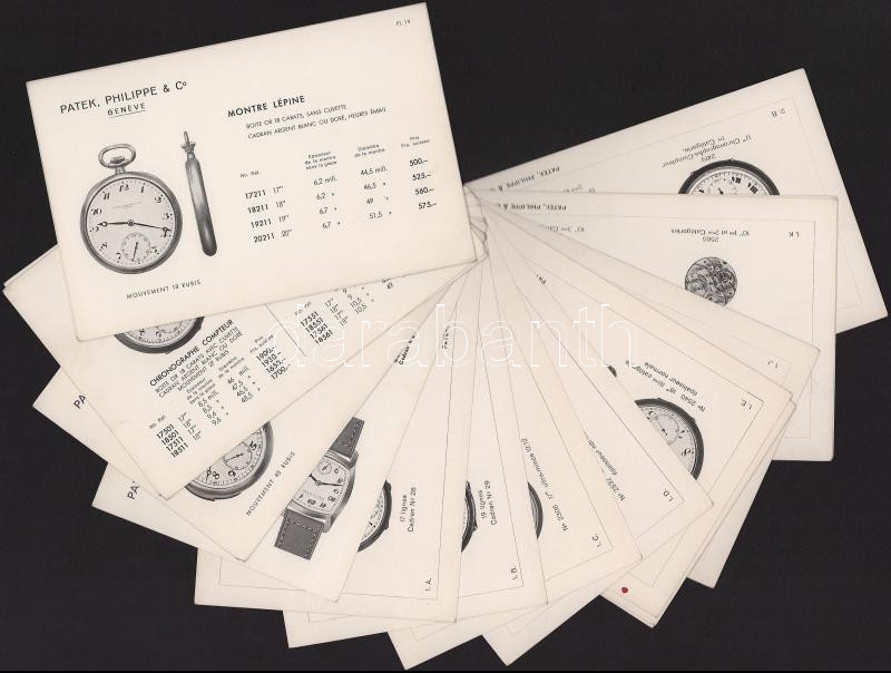 1929 A vájci Patek Philippe & Co. óragyártó cég termékeinek árlapjai, 6p+19 kartonlap oldal zseb- és karóra képekkel és árakkal