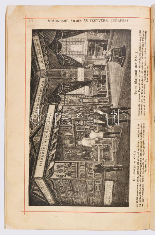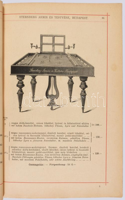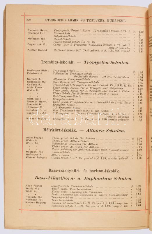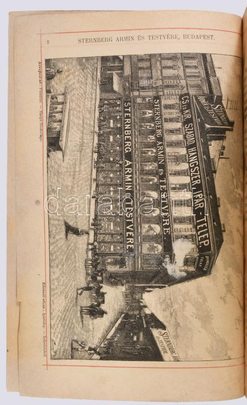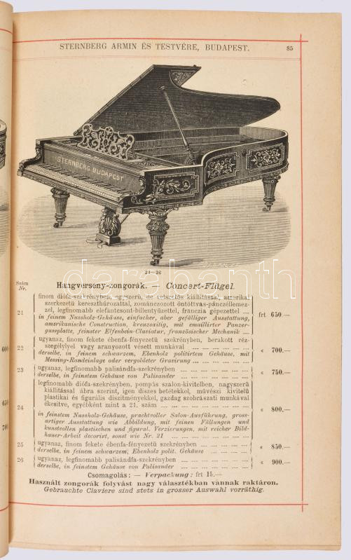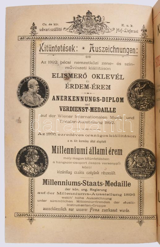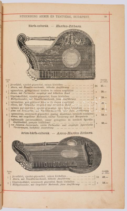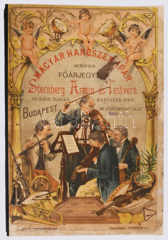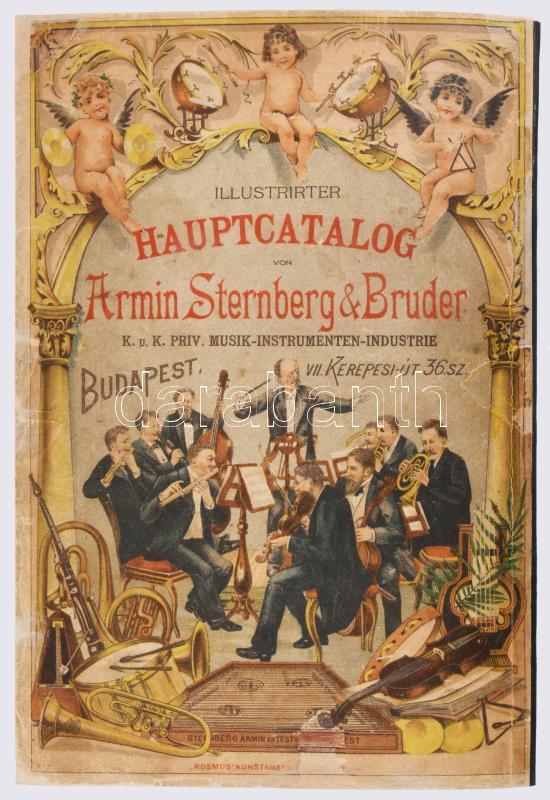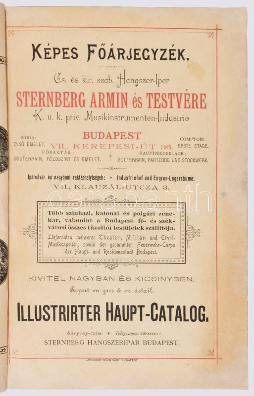 cca 1892 Magyar Hangszer-Ipar Sternberg Ármin és Testvére Képes Főárjegyzék. Cs. és Kir. Szabad Hangszer-Ipar. K. u. K. Priv. Musikinstrumenten-Industrie. Illustrirter Haupt-Catalog. Bp.,én.,Sternberg Ármin és Testvére,("Kosmos"-ny.), 312 p. Rendkívül gazdag fekete-fehér képanyaggal illusztrált. Kiadói színes, litografált illusztrált papírkötés, restaurált borítóval és javított, pótolt gerinccel, de ezt leszámítva jó állapotban, modern karton-tokban. Ritka, aukción még nem szerepelt!
