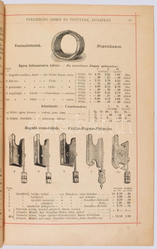 A Sternberg Ármin és Testvére cs. és kir. udvari hangszergyárat 1881-ben alapította Sternberg Ármin (1861-1928), a vállalkozás fő tevékenysége a hangszerkereskedelem volt, de hangszergyártással, -bérléssel, -hangolással és -karbantartással is foglalkozott. Megannyi hangszert és mindenféle zenéhez köthető tárgyat (rádiók, gramofonok, egyéb hangtechnikai berendezések, zenélő dísztárgyak stb.) kínált eladásra a cég, amely a Kerepesi (Rákóczi) út 36. (1912-től Rákóczi út 60.) alatt működött. Sternberg Ármin híres volt hihetetlenül ötletes, látványos, hatásvadász üzleti reklámjairól, amit az árverésre kínált igen ritka tétel is igazol. Feltehetően 1892-ben adták ki ezt a vaskos, igen gazdagon illusztrált képes árjegyzéket, egyúttal megjegyzendő, hogy a népszerűsítés ezen módját az 1880-as évek végétől alkalmazta a tulajdonos.