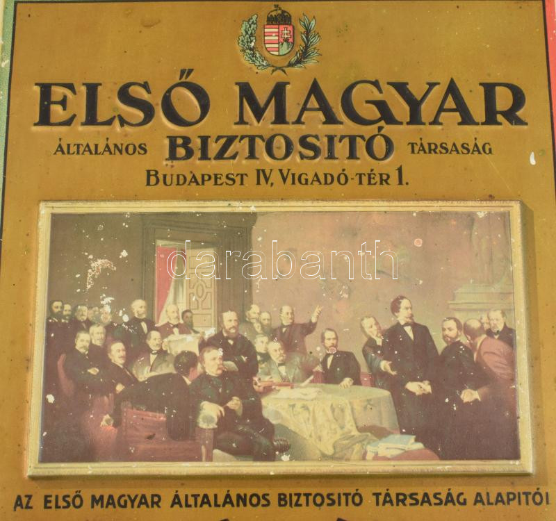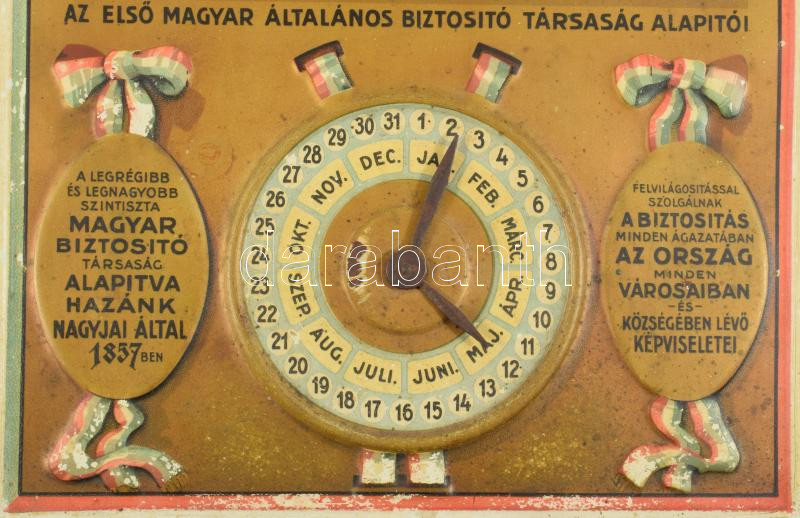 ca 1930 Első Magyar Biztosító rt nagy méretű mechanikus fém asztali naptár. Állítható, festett fém, az alapítást bemutató történelmi esemény képével, kis kopással 25x36 cm