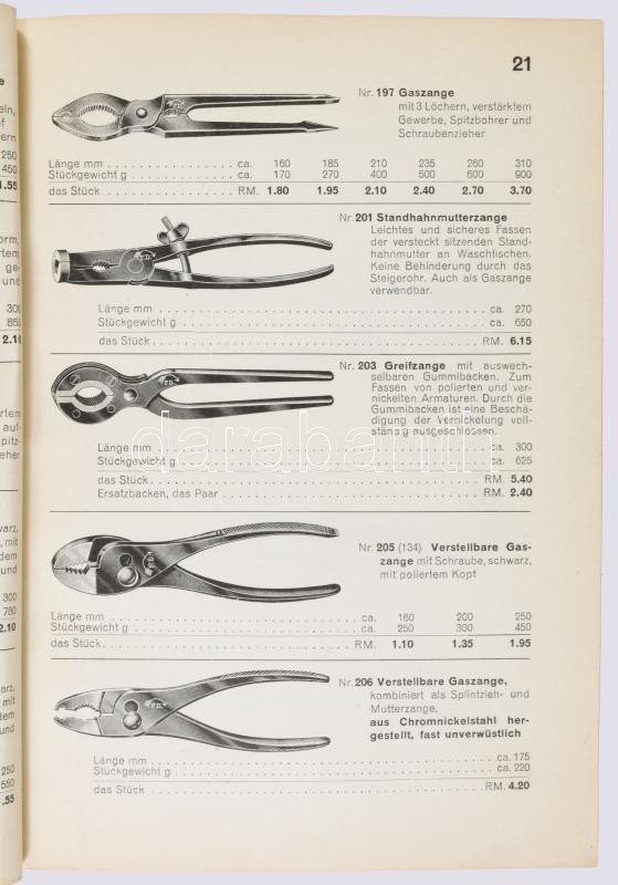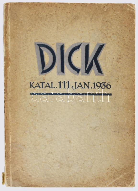 Paul F. Dick Esslingen a[m] N[eckar]. Werkzeuge Für Metall-, Holz- und Steinbearbeitung. Katalog Nr. 111. Januar 1936. Esslingen am Neckar, 1936, Paul F. Dick, 164 p. Német nyelven. Gazdag képanyaggal illusztrált. A címlapon "Dick"-művek vezérképviselete Wittmann Hugó Budapest, VIII. Elemér-u(tca.),..." bélyegzésével. Kiadói papírkötés, kissé kopott, foltos borítóval, a gerincen apró sérüléssel.