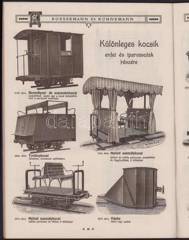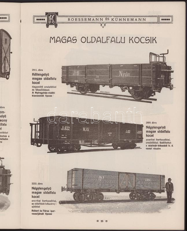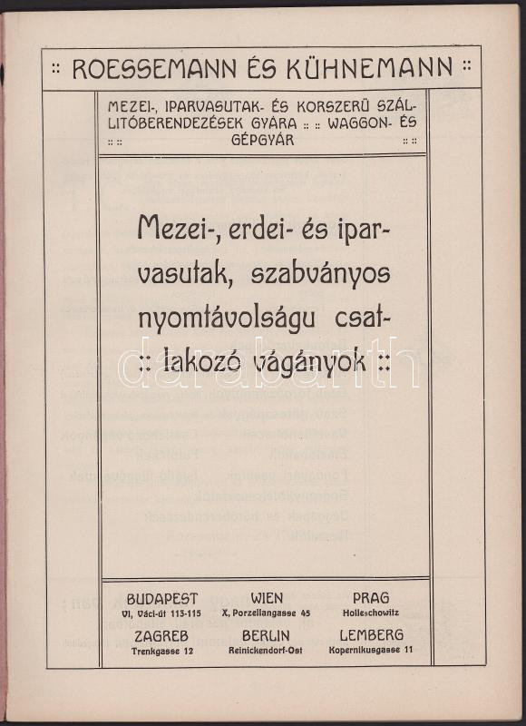 ca 1900 Mezei-, erdei és iparvasutak, szabványos nyomtávolságú csatlakozó vágányok. A Rosemann & Kühnemann gépgyár képes vasúti szerelvények, vagonok és egyéb gépek képes katalógusa. 72 p.