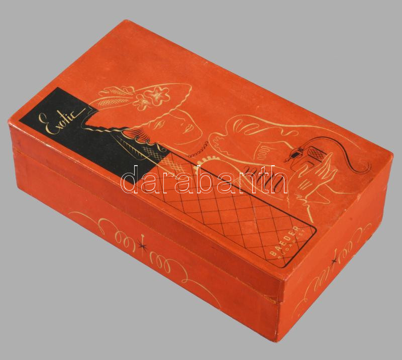 cca 1935 K. Lukáts Kató (1900-1990) iparművész Exotic Kölni, Baeder, Budapest art deco grafikájú doboza, alján Király Gyuláné Illatszertár Kolozsvár (Erdély) címkével, szép állapotban, 16,5×9,5×5 cm