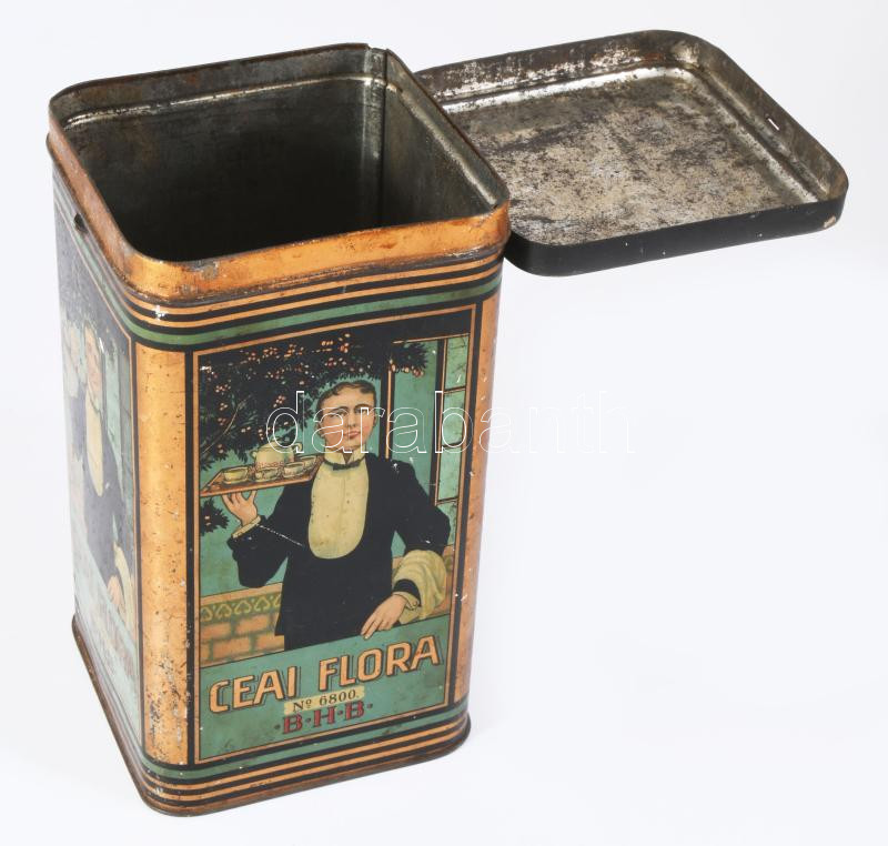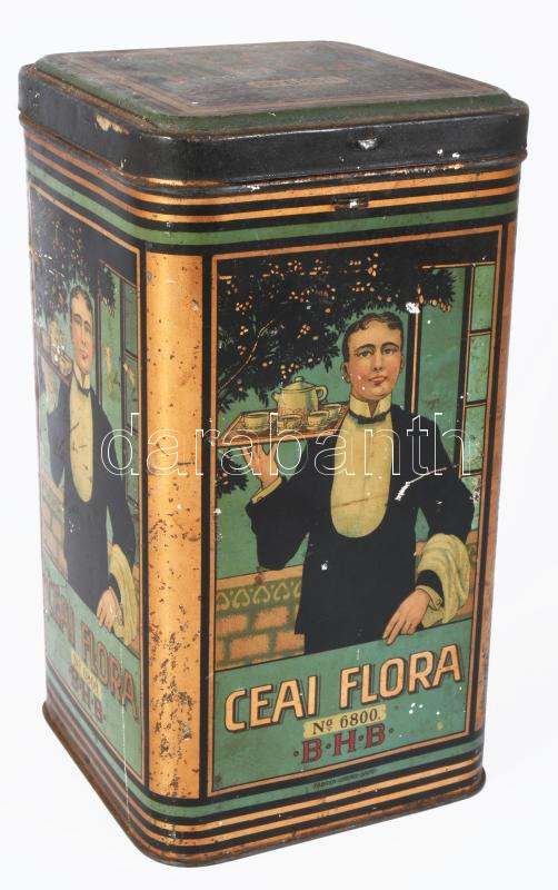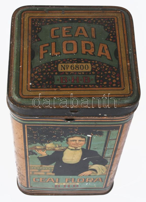 "Ceai Flora No. 6800 BHB" teás fémdoboz, kopott, 18x10x10 cm