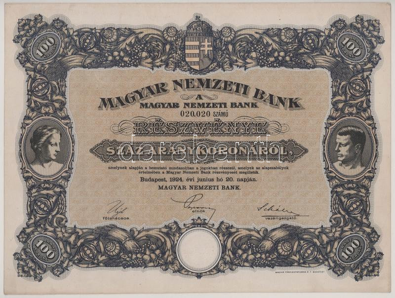 Hungary 1924. "Magyar Nemzeti Bank (Hungarian National Bank)" Hungarian National Bank share about 100 Korona "020.020" with embossed stamp on watermarked paper C:XF