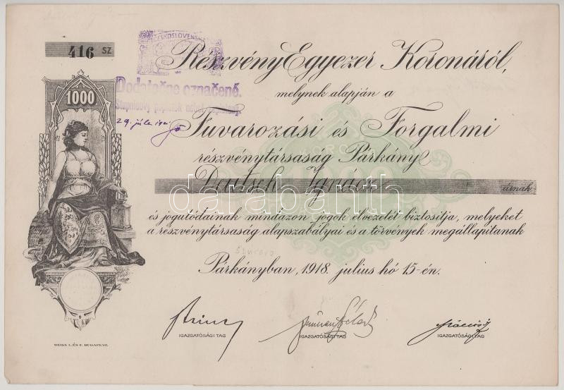 1918. Párkány "Fuvarozási és Forgalmi részvénytársaság" részvénye 1000K-ról, szárazpecséttel, csehszlovák bélyeggel, szelvényekkel T:XF