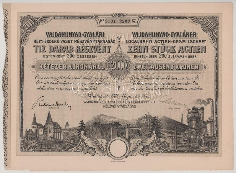 1907. Budapest "Vajdahunyad-Gyalári Helyi - Érdekű Vasút Részvénytársaság" részvénye 200K-ról szárazpecséttel, szelvényekkel T:AU / Hungary / Budapest 1907. "Vajdahunyad-Gyalári Helyi - Érdekű Vasút Részvénytársaság (Vajdahunyad-Gyalár Local - Interest Railway Share Company)" share about 200 Kronen with embossed stamp and coupons C:AU