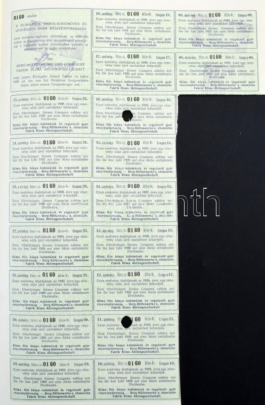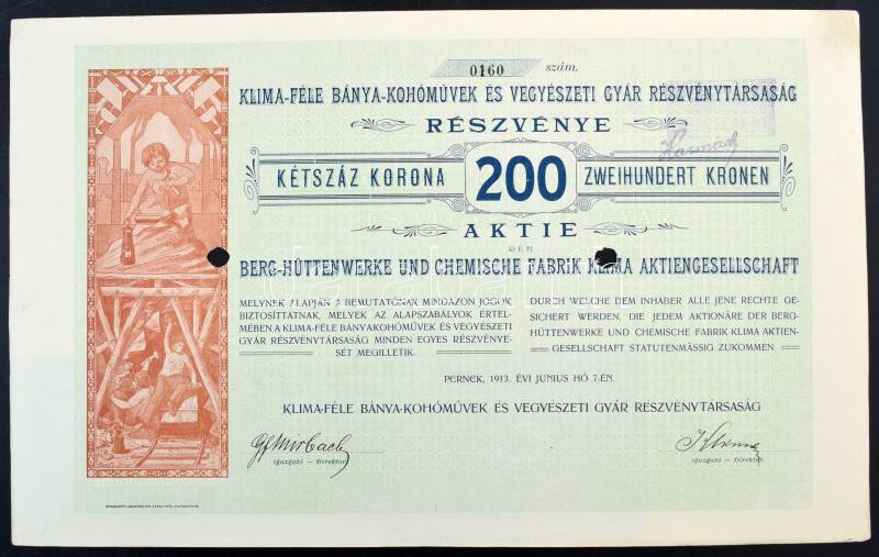 Hungary / Pernek 1913. "Klima-féle Bánya-Kohóművek és Vegyészeti Gyár Részvénytársaság" (Klima Mining, Smelting and Chemical Plant Joint Stock Company) share about 200 Korona, with coupons, stamps and embossed stamp, cancelled by holes C:XF spotted