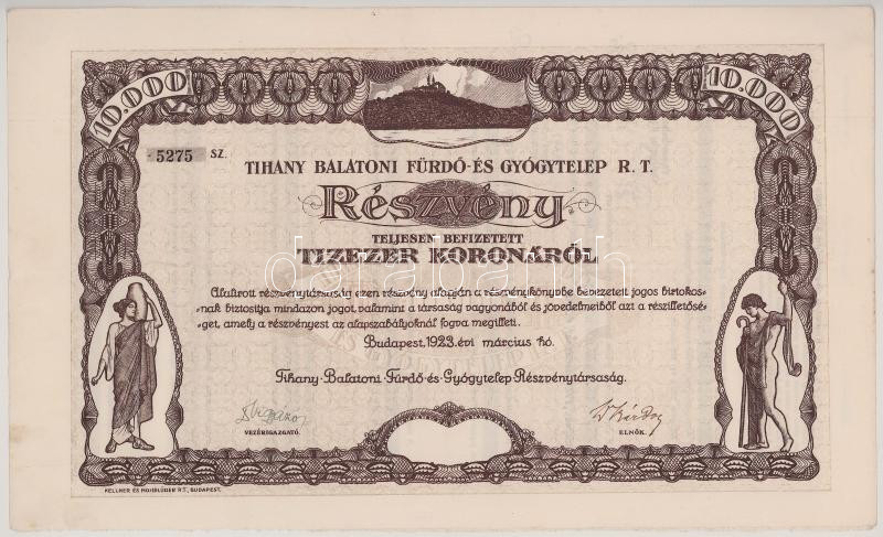 1923. Budapest "Tihany Balatoni Fürdő- és Gyógytelep Részvénytársaság" részvénye 10.000K-ról, szelvényekkel, szárazpecséttel T:XF