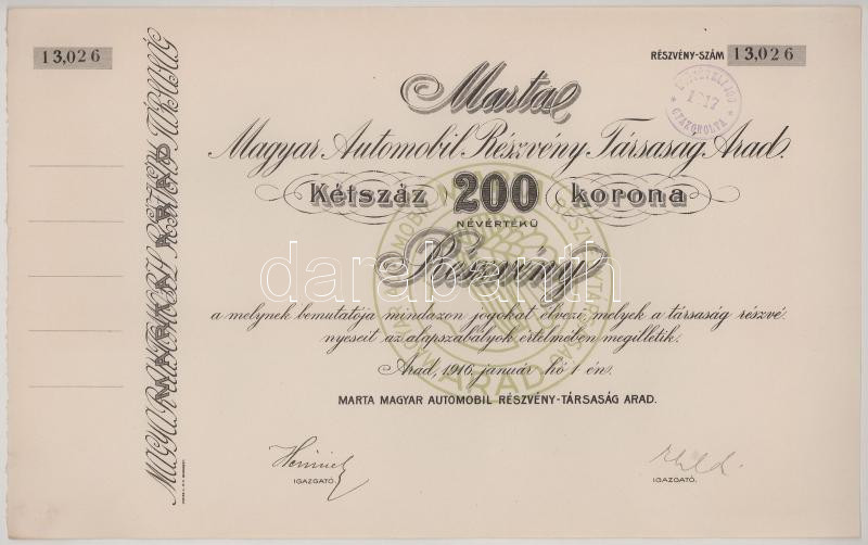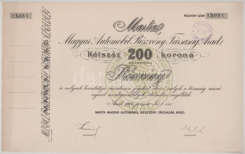 1916. Arad "Martal Magyar Automobil Részvénytársaság" részvénye 200K-ról, szárazpecséttel, bélyegzéssel, szelvényekkel T:AU