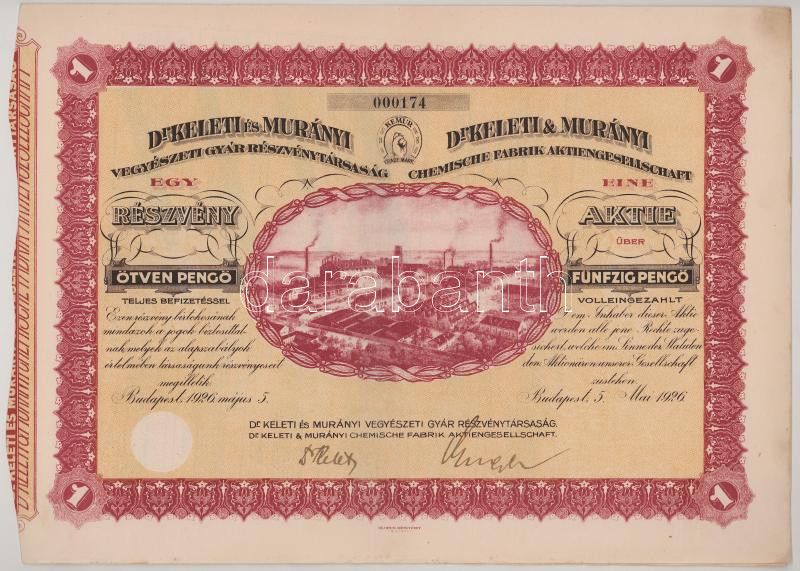 Hungary 1926. Budapest "Dr. Keleti and Murányi Chemical Factory Joint Stock Company" share about 50 Pengő, with embossed stamp and coupons T:XF