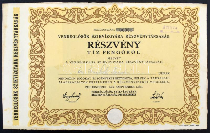 Hungary Pesterzsébet (Budapest) 1923. "Restaurateurs' Szikviz Factory Joint Stock Company" registered share about 10 Pengő, with coupons and embossed stamp C:XF unfolded, but tear and spots
